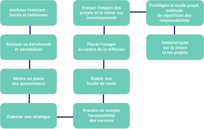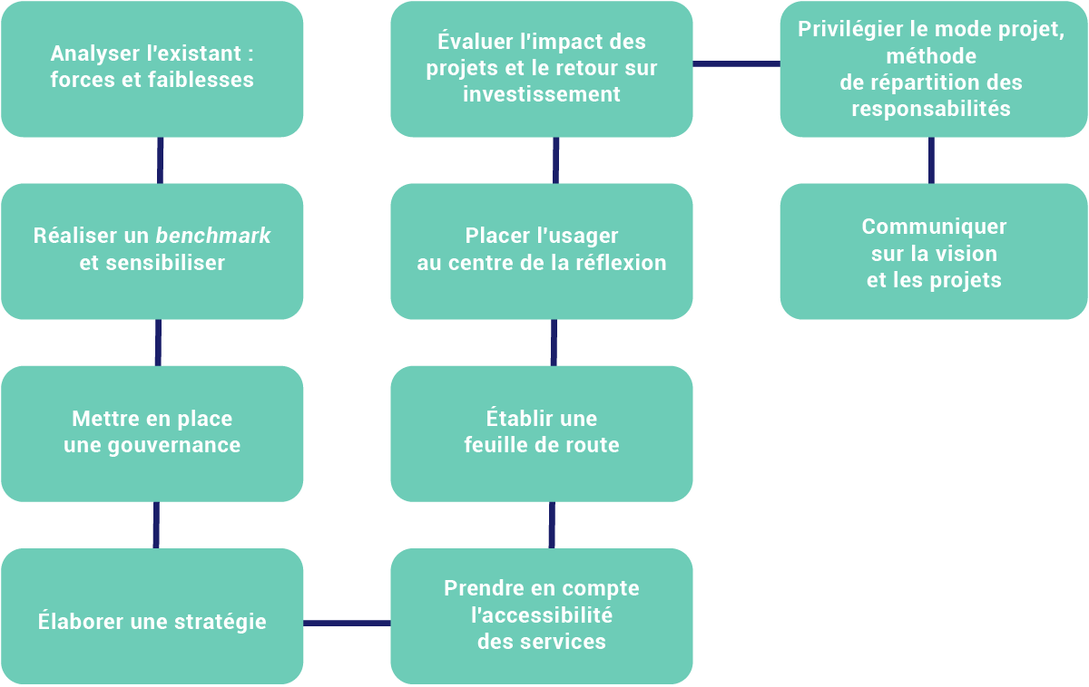 Une fois le mouvement de numérisation de l’autorité locale lancé et consolidé, on peut en assurer le suivi et l’intégrer dans des démarches locales de manière plus large, à travers :