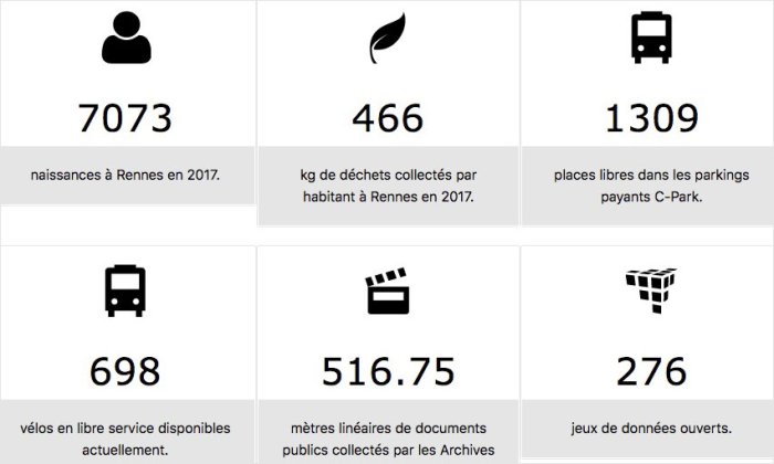 Depuis 2010, Rennes Métropole et la municipalité de Rennes utilisent une plateforme web pour diffuser leurs données publiques. Plus de deux cents jeux de données y sont disponibles, provenant des administrations rennaises et métropolitaines et de partenaires publics ou privés du territoire (Kéolis, Citédia, TransMusicales, Les Champs Libres…).